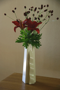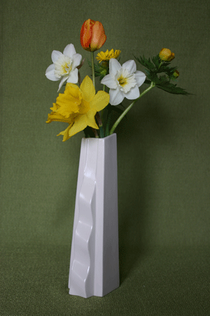 JOKI -maljakkoon voi tehdä monenlaisia kukka-asetelmia. Toimii myös yhden kukan maljakkona; kerpera, ruusu, kalla, onnenkukka ... Maljakon pariksi sopii JOKI -kynttilänjalka Koko: korkeus 27 cm leveys 7 cm Värit: luonnonvalkoinen ja kaksivärinen: sisäpuoli sininen, turkoosi, vihreä ulkopuoli sininen, turkoosi, vihreä Valmistus: vitroposliinivalusavesta valaminen, lasite korkeanpolton lasite