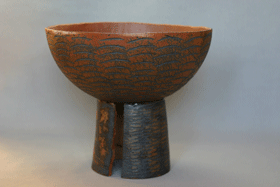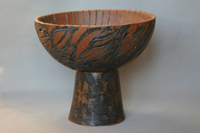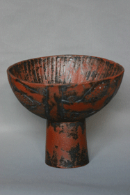 Punasavikulhot on tarkoitettu käyttö- ja sisustusesineiksi esim. hedelmäkulhoksi. Saven huokoisuuden ja patinan vuoksi ei pidä pitkään vettä, vesi imeytyy kulhon seinämään. Sisäosa on mahdollista lasittaa, jolloin kulho pitää myös nestemäiset aineet. Valmistus: käsinrakennusmenetelmin apumuottia käyttäen patina tai lasitepoltto 1000-1040 asteessa Väri: vaihtelee vaaleasta terracotasta tummaan sen mukaan, mitä punasavea käytän, missä asteessa poltan ja minkä verran laitan pintaan ja kuvioihin patinaa Koko: korkeus 23 - 25 cm leveys 25 cm Kulhojen koristelussa käytän myös värillisiä matalanpolton lasitteita ja kulhon sisäosan voin tarvittaessa lasittaa kirkkaalla lasitteella